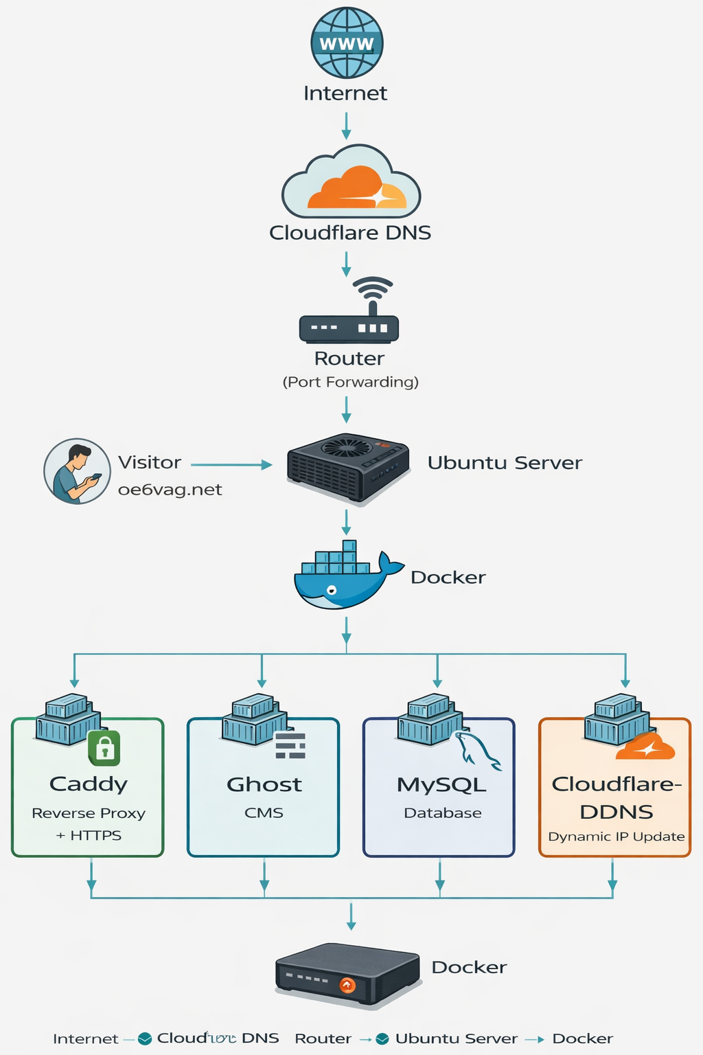 This page describes the architecture of the self hosted web platform used to run the website oe6vag.net. The system is designed to be lightweight, secure, and maintainable while running on a home server with a dynamic internet connection.